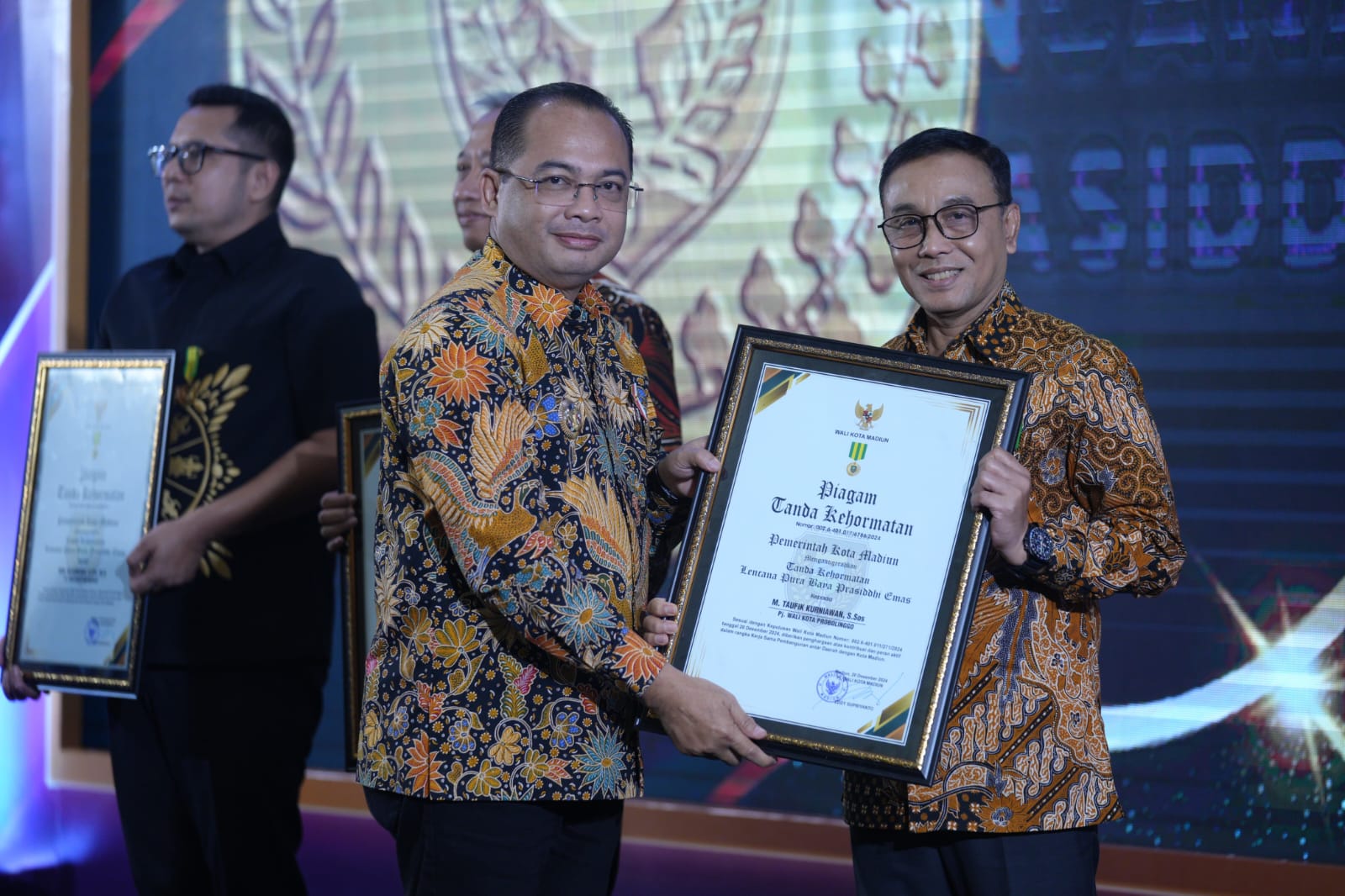 Berikutnya, Pj. Wali Kota M. Taufik Kurniawan juga menerima Lencana dan Piagam Penghargaan Lencana Pura Baya Prasiddhi Emas dari Pemerintah Kota Madiun yang diserahkan oleh Pj. Wali Kota Madiun Eddy Supriyanto.