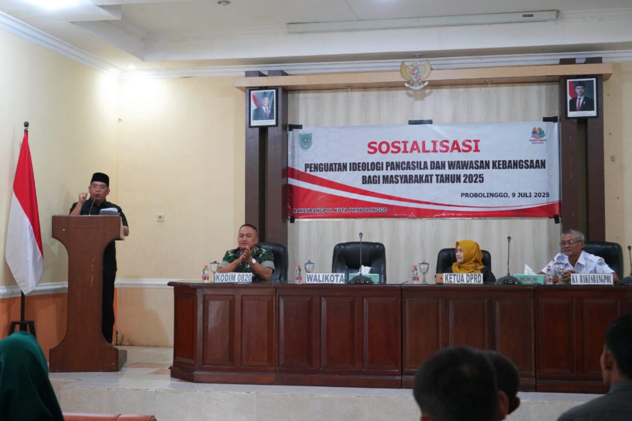 MAYANGAN - Badan Kesatuan Bangsa dan Politik (Bakesbangpol) Kota Probolinggo menggelar kegiatan Sosialisasi Penguatan Ideologi Pancasila dan Wawasan Kebangsaan bagi masyarakat, Rabu (9/7) pagi, di aula kantor Bakesbangpol setempat. Kegiatan ini dibuka langsung oleh Wali Kota Probolinggo dr. Aminuddin dan menghadirkan dua narasumber utama, yakni Ketua DPRD Kota Probolinggo Dwi Laksmi Syntha Kusumawardhani dan Pabung Kodim 0820, Mayor Edy Surnoto.