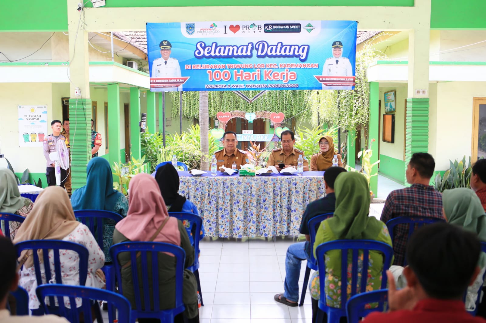 KADEMANGAN - Sejumlah perwakilan warga Kelurahan Triwung Lor tampak berkumpul di kantor kelurahan setempat, Senin (14/4) siang. Diantaranya dari pengurus RT, RW, LPM, Karang Taruna, Pokmas, Babinsa, dan Bhabinkamtibmas. Kehadiran mereka untuk mengikuti kegiatan 100 Hari Kerja Program Wali Kota dr. Aminuddin, Berkantor di Kelurahan.
