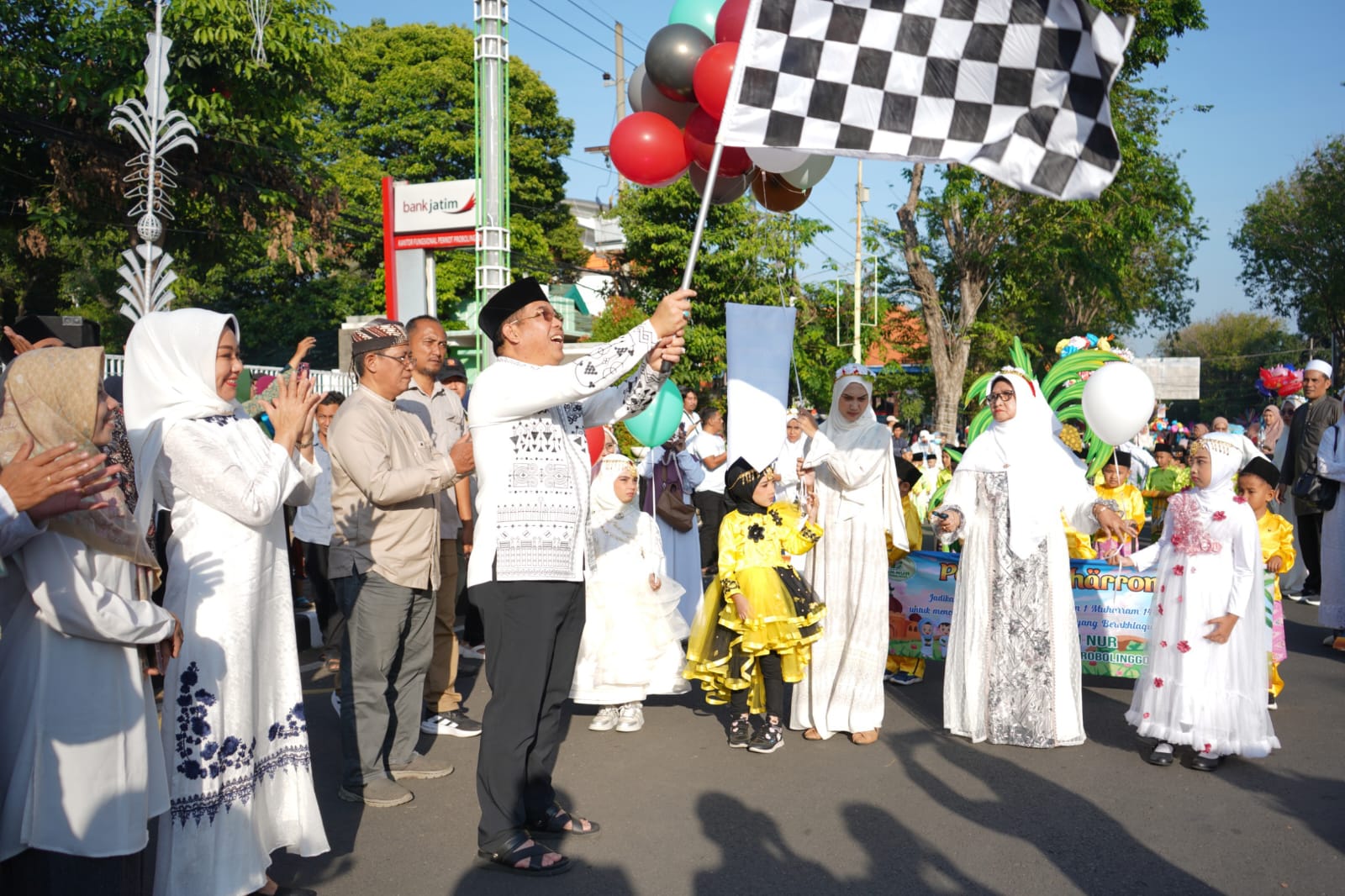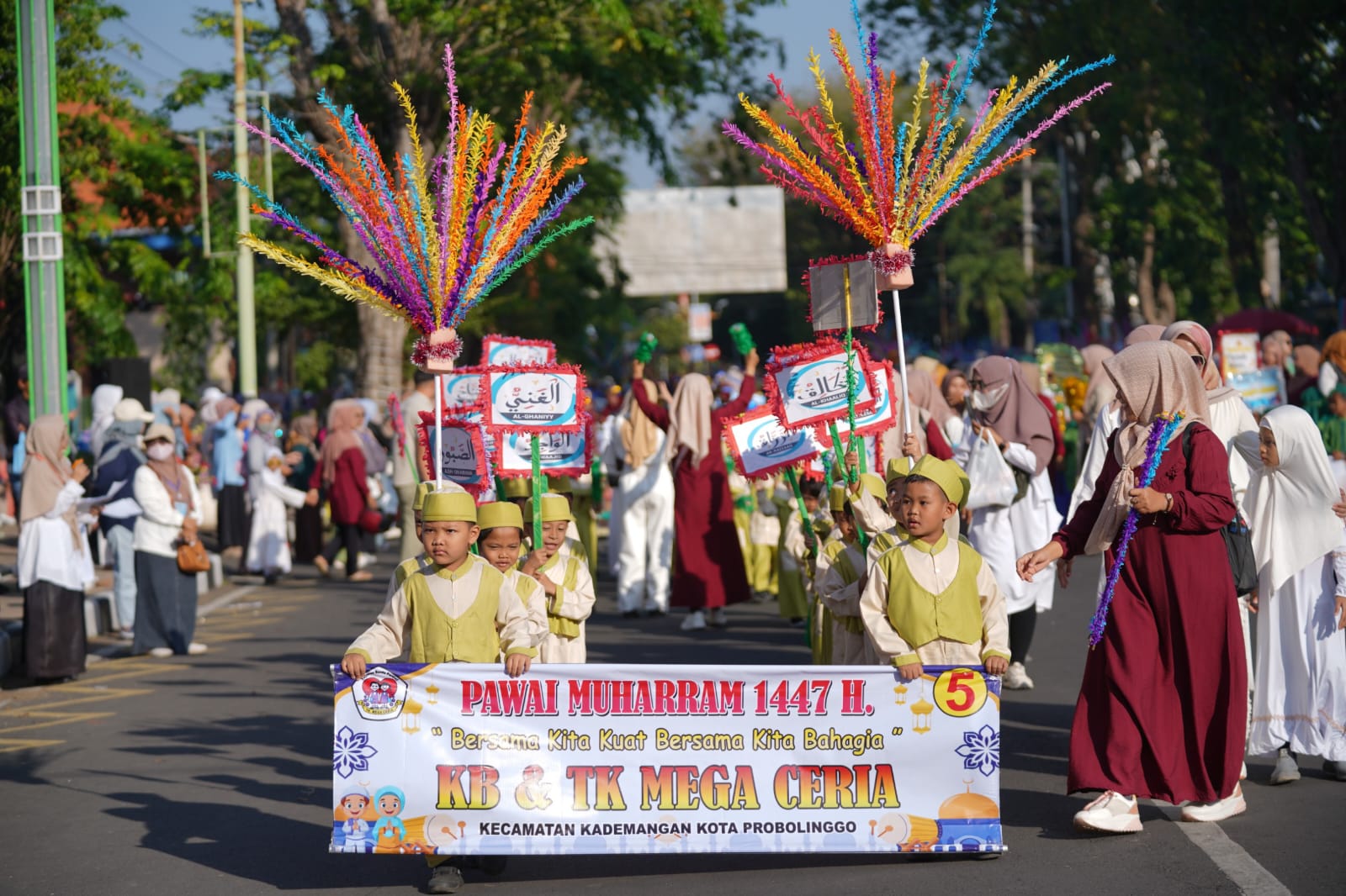 MAYANGAN - Suasana penuh semangat dan keceriaan mewarnai Pawai Muharram TK/RA/BA se-Kota Probolinggo di depan Kantor Wali Kota Probolinggo, Sabtu (19/7). Kegiatan ini diselenggarakan dalam rangka memeriahkan Tahun Baru Islam 1 Muharram 1447 H dengan mengusung tema “Tingkatkan Taqwa, Mantapkan Akhlak Mulia Sejak Usia Dini.”