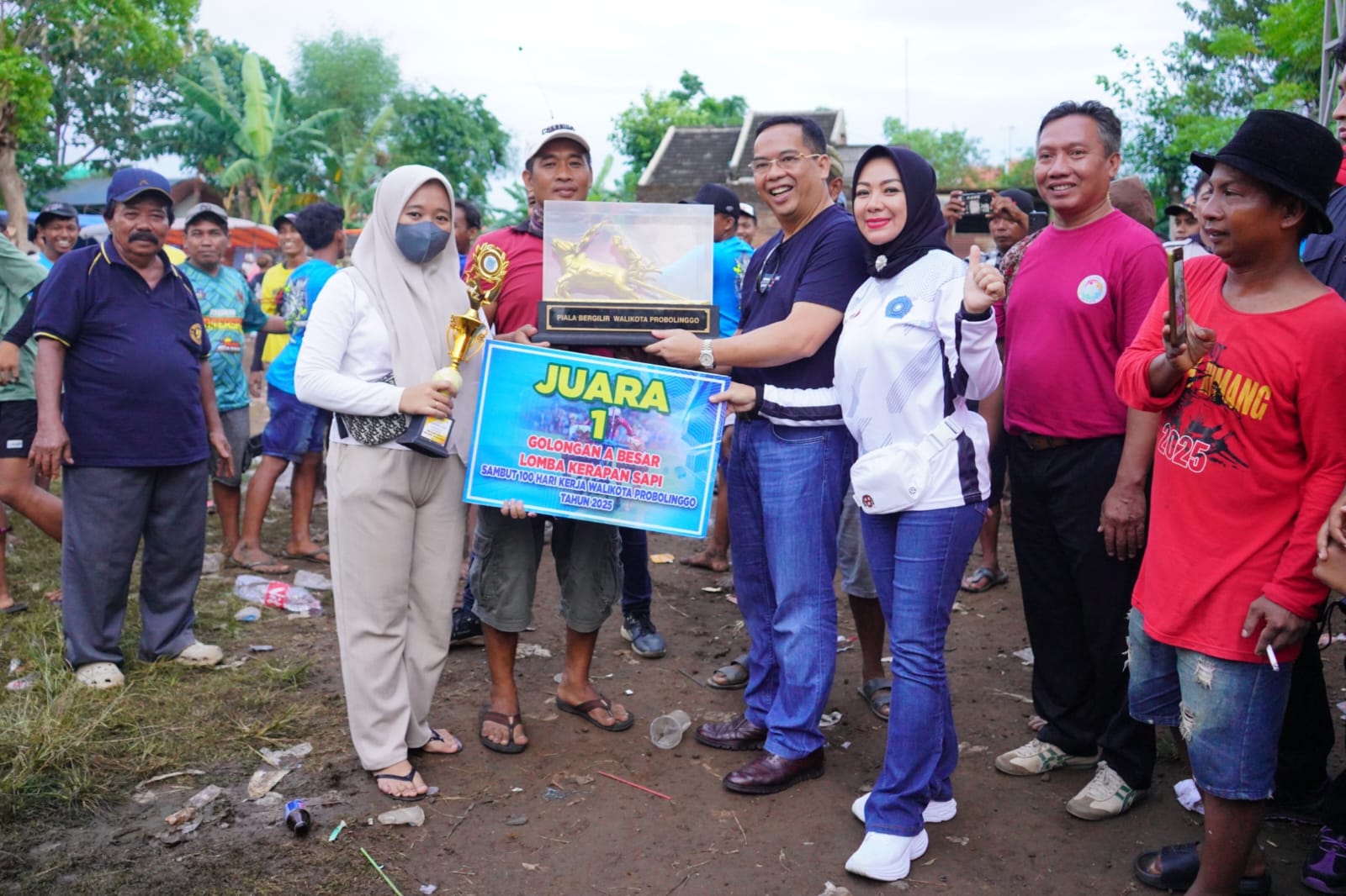 Wali Kota dr. Aminuddin, didampingi istri yang juga Ketua TP PKK Kota Probolinggo, dr. Evariani, turut menyaksikan langsung jalannya perlombaan. “Saya ucapkan terima kasih kepada panitia, dan selamat untuk para pemenang yang sudah menunjukkan kemampuan terbaiknya hari ini. Karapan sapi ini bukan hanya lomba, tapi juga identitas budaya yang harus kita jaga bersama,” ucapnya penuh semangat.