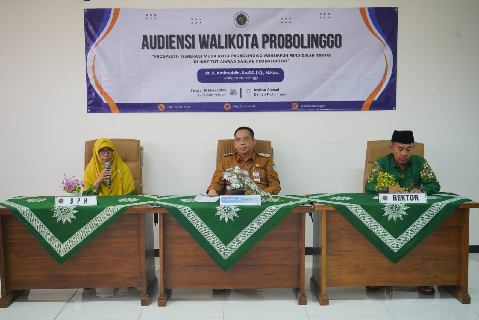 KEDOPOK - Wali Kota Probolinggo dr. Aminuddin, melakukan kunjungan ke Institut Ahmad Dahlan (IAD) Probolinggo, Selasa (25/3) siang. Kedatangannya disambut oleh Rektor IAD, Benny Prasetya, serta perwakilan Badan Pembina Harian IAD, jajaran wakil rektor dan dosen. Kunjungan ini dikemas dalam agenda audiensi bertajuk "Prospektif Generasi Muda Kota Probolinggo Menempuh Pendidikan Tinggi di Institut Ahmad Dahlan Probolinggo”, sekaligus diisi dengan pemaparan mengenai profil kampus oleh rektor.
