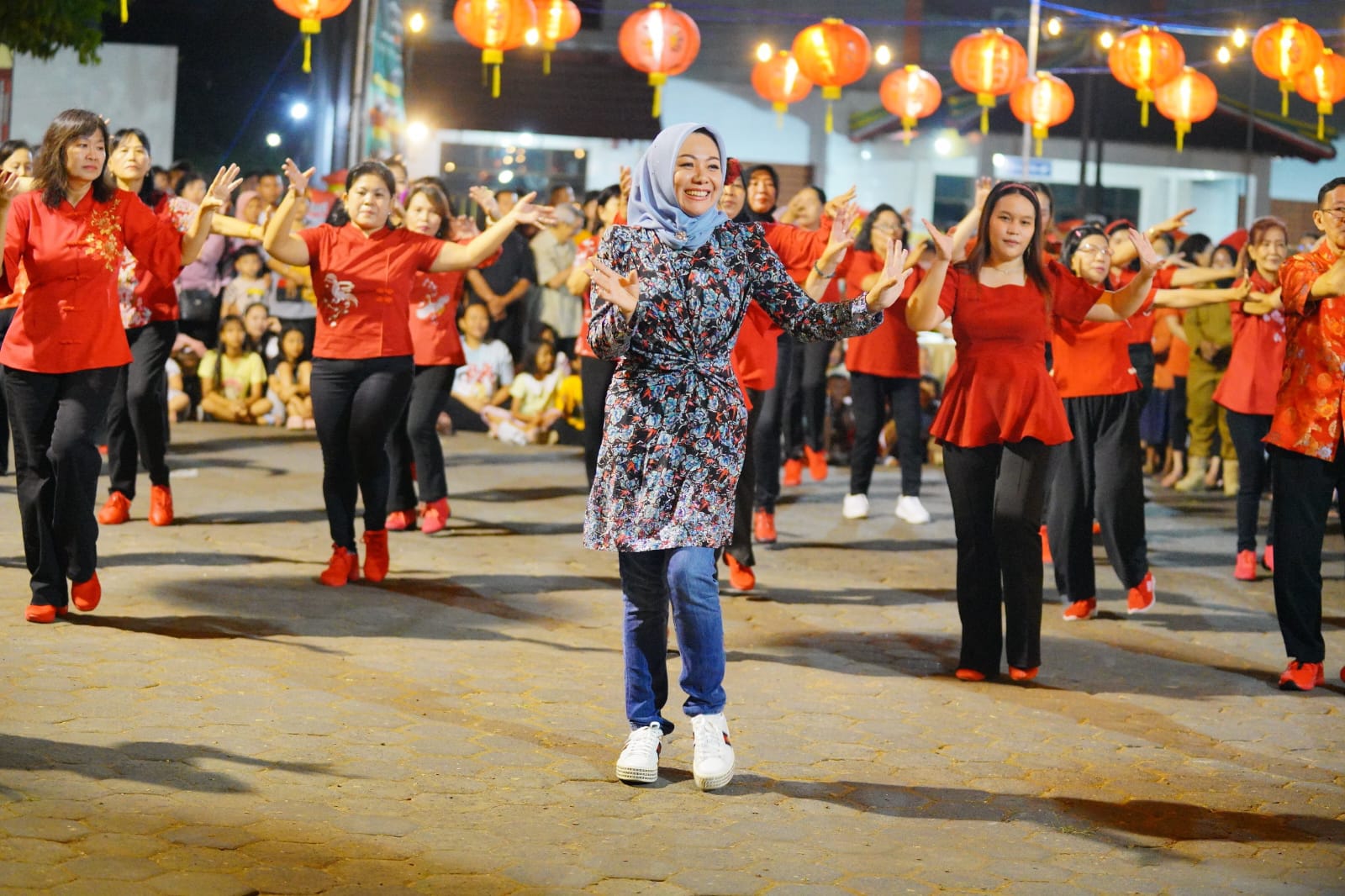 Usai sambutan, panggung seni pun dimulai. Anak-anak dari sekolah mingguan TITD membuka pertunjukan dengan tari snukits, disusul atraksi siang kung, peragaan model Miss Tionghoa, line dance dari Serenity, hingga atraksi bantengan dan barongsai. Menariknya, dr. Evariani Aminuddin dan Kepala BPS Mouna Sri Wahyuni ikut menari dalam penampilan line dance.