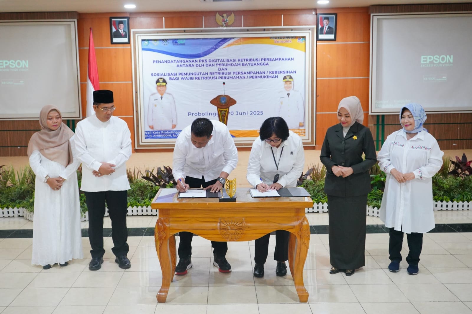 KANIGARAN - Pemerintah Kota Probolinggo melalui Dinas Lingkungan Hidup (DLH) Kota Probolinggo melakukan Penandatanganan Kerja Sama (PKS) Digitalisasi Retribusi Persampahan dengan Perusahaan Air Minum Daerah (Perumdam) Bayuangga Kota Probolinggo, Jumat (20/6) di Puri Manggala Bhakti Kantor Wali Kota Probolinggo.