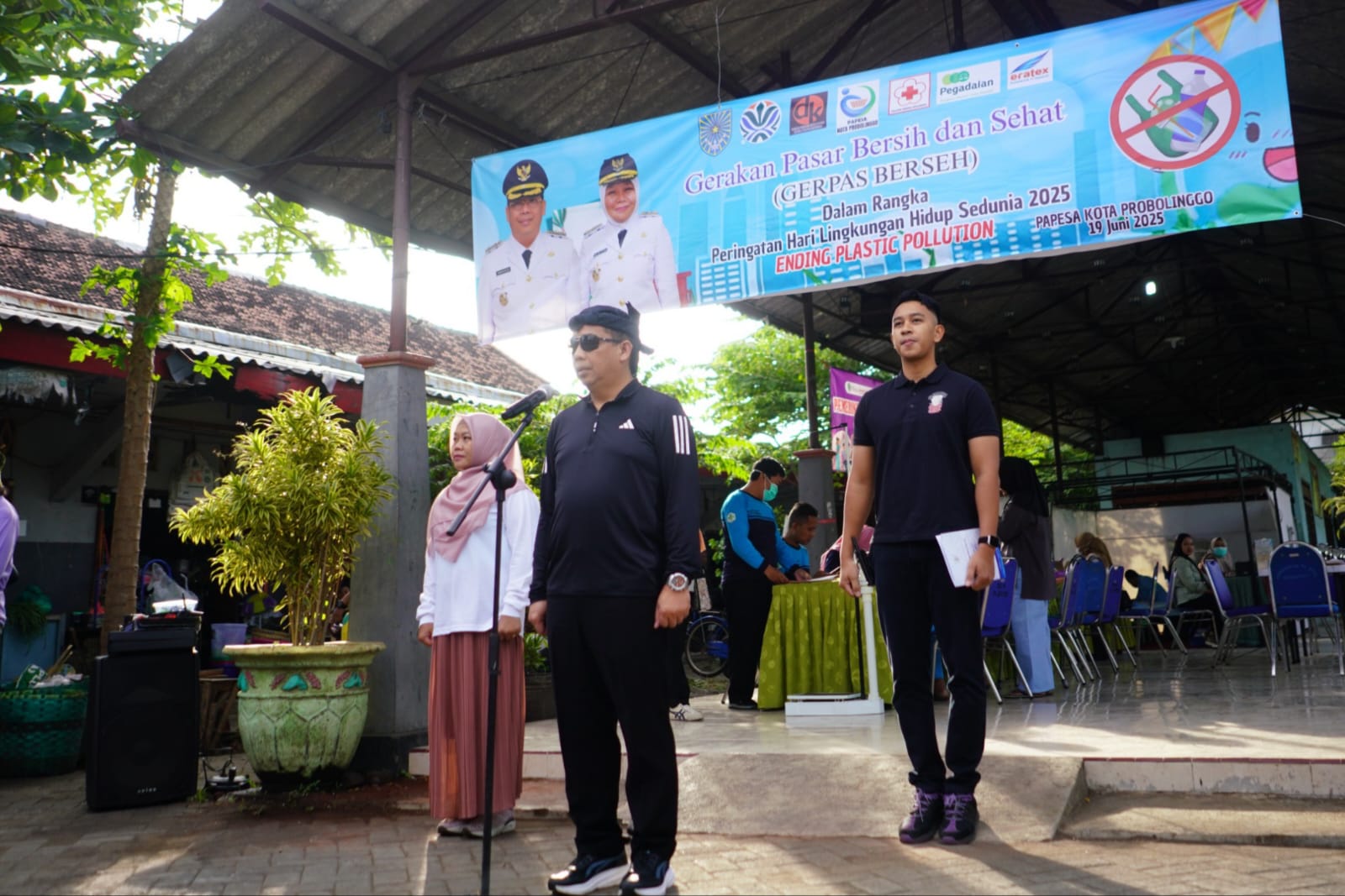 MAYANGAN - Wali Kota Probolinggo, dr. H. Aminuddin dan Wakil Wali Kota Probolinggo, Ina Dwi Lestari mengajak seluruh elemen masyarakat untuk semakin peduli terhadap lingkungan, khususnya dalam memerangi sampah plastik, melalui aksi Gerakan Pasar Bersih dan Sehat (Gerpas Berseh) yang digelar dalam rangka memperingati Hari Lingkungan Hidup Sedunia 2025 dengan tema global Ending Plastic Pollution, Kamis (19/6) pagi di Pasar Randu Pangger.