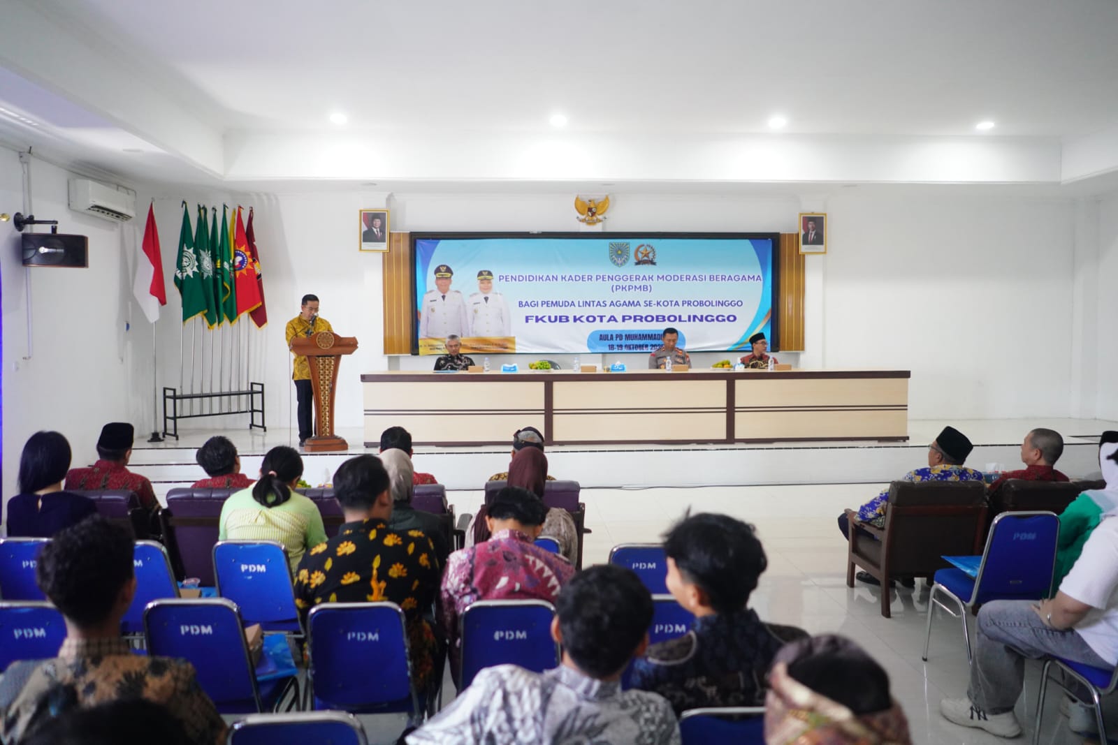 KANIGARAN - Wali Kota Probolinggo, dr. Aminuddin, membuka kegiatan Pendidikan Kader Penggerak Moderasi Beragama (PKPMB) Segmen Kepemudaan yang digelar oleh Forum Kerukunan Umat Beragama (FKUB) Kota Probolinggo, Sabtu (18/10) di Aula PD Muhammadiyah Kota Probolinggo.
