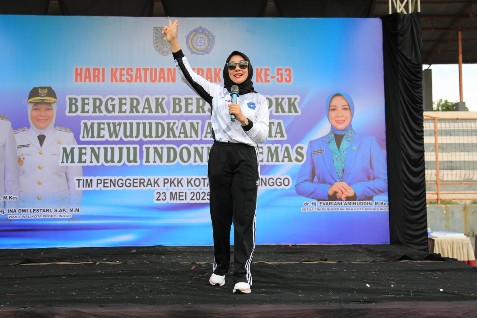 MAYANGAN—Dalam rangka memperingati Hari Kesatuan Gerak (HKG) PKK ke-53, Wali Kota Probolinggo dr. Aminuddin dan Wakil Wali Kota Ina Dwi Lestari serta Ketua Tim Penggerak PKK Kota Probolinggo dr Evariani Aminuddin turut serta dalam kegiatan senam massal yang digelar di Stadion Bayuangga, Jumat (23/5) pagi.