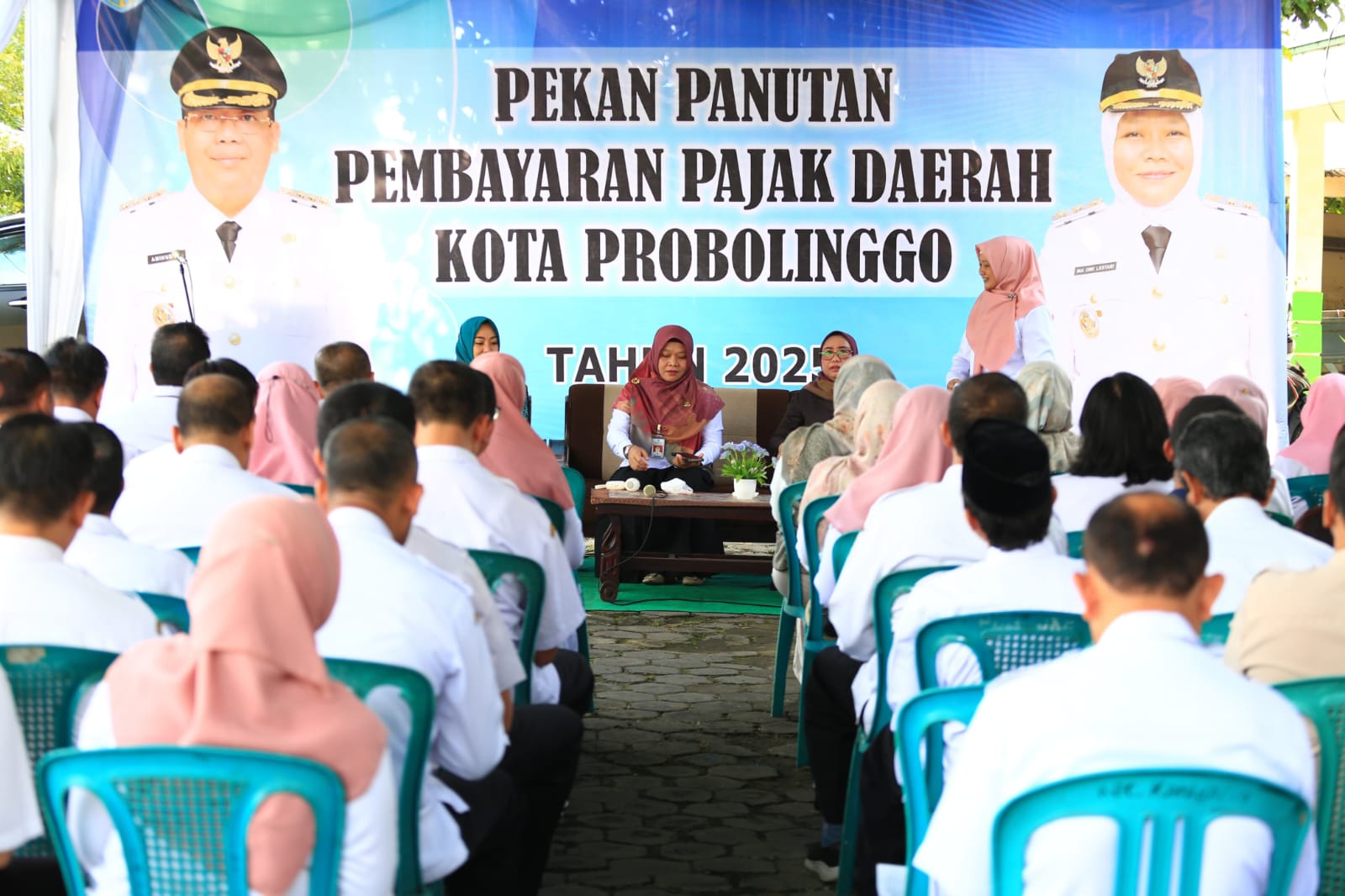 KANIGARAN – Dalam rangka memberikan edukasi kepada masyarakat mengenai digitalisasi pembayaran Pajak Daerah, Pemerintah Kota Probolinggo menggelar Pekan Panutan Pelunasan Pajak Bumi dan Bangunan (PBB) Tahun 2025 di Halaman Kantor Kelurahan Kebonsari Wetan, pada Rabu (19/3). Kegiatan ini dihadiri oleh Wakil Wali Kota Probolinggo Ina Dwi Lestari, Ketua TP PKK Kota Probolinggo dr. Evariani, Wakil DPRD Kota Probolinggo, Pimpinan Bank Indonesia Kantor Perwakilan Wilayah Malang serta pimpinan Bank Jatim Cabang Probolinggo. Para peserta kegiatan ini juga terdiri dari Kepala Perangkat Daerah di lingkungan Pemerintah Kota Probolinggo