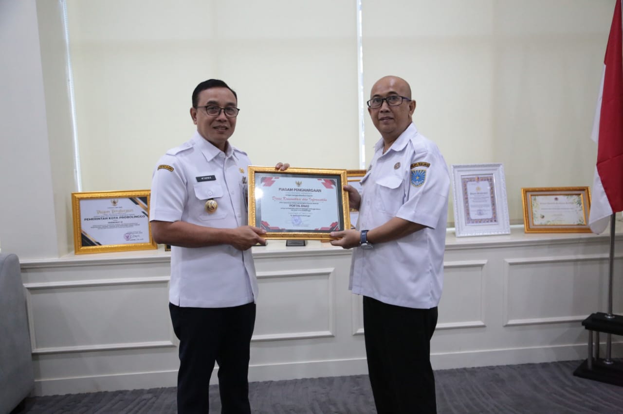 Probolinggo - Pj. Wali Kota M. Taufik menyerahkan piagam penghargaan kepada 4 perangkat daerah dan 2 lembaga pendidikan yang berpartisipasi aktif dalam pengisian Indeks Inovasi Daerah (IID) Pemerintah Kota Probolinggo di ruang kerjanya pada Rabu (5/2). Penghargaan ini diberikan kepada mereka yang dinilai paling inovatif melakukan terobosan penting dalam penyelenggaraan pemerintahan, baik dalam hal pelayanan publik, tata kelola pemerintahan dan urusan lain yang masih dalam kewenangan daerah.