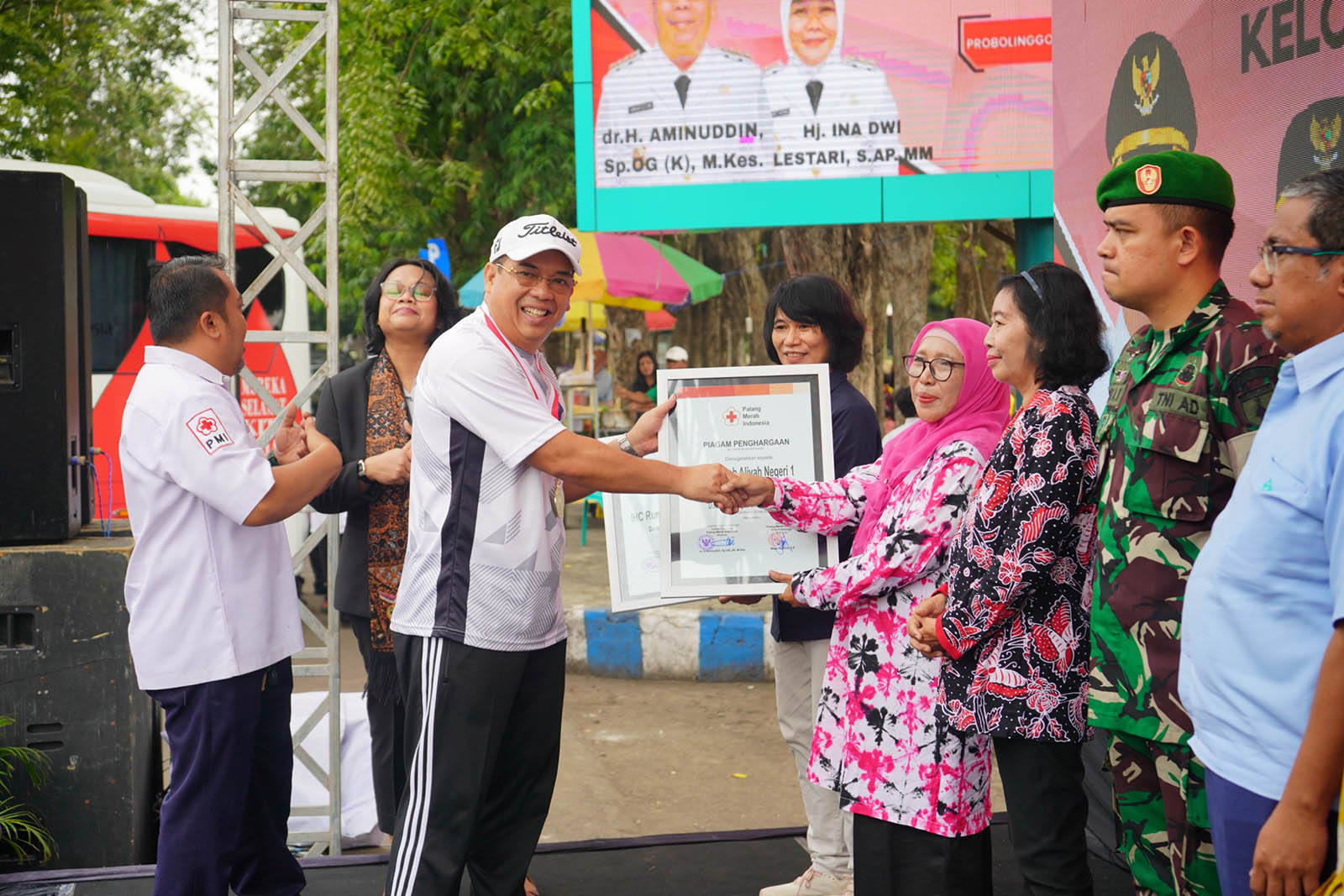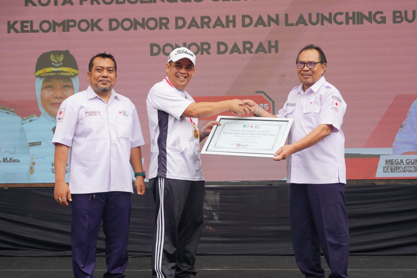 MAYANGAN - Sekretaris PMI Provinsi Jawa Timur Edi Purwinarto mengungkapkan terima kasihnya atas komitmen kader penggerak kelompok donor darah masuk dalam potret kinerja kinerja 100 hari Wali Kota dr Aminuddin dan Wawali Ina Dwi Lestari, Jumat (23/5) di Alun-alun Kota Probolinggo.