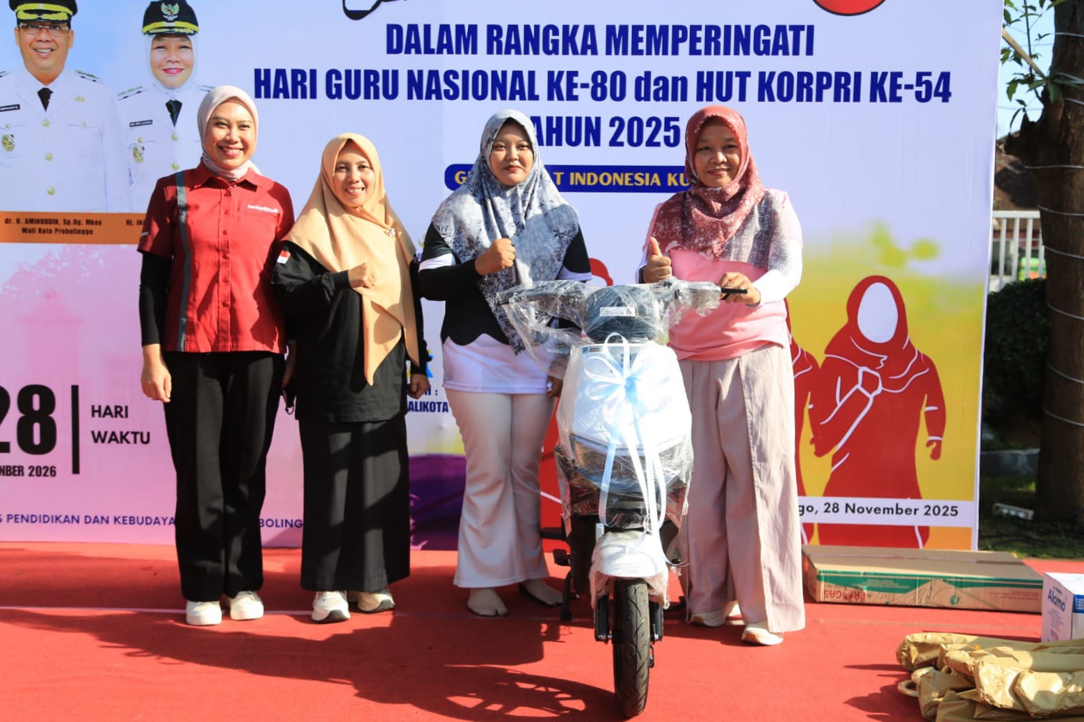 "Alhamdulillah senang sekali dan tidak menyangka dapat undian sepeda listrik dari jalan santai hari ini, motornya bisa buat kerja saya ngajar di TK Barunawati 1 Jrebeng Wetan. Semoga peringatan hari guru tahun ini sesuai temanya, 'Guru Hebat, Indonesia Kuat'," harapnya.