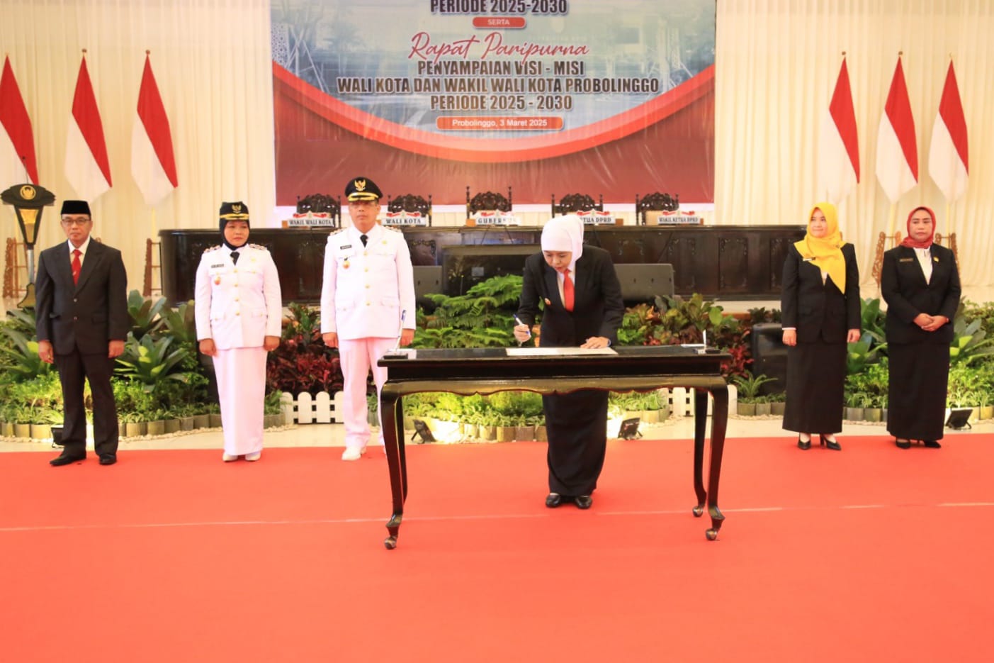 KANIGARAN - Prosesi Serah Terima Jabatan (Sertijab) serta Rapat Paripurna Penyampaian Visi Misi Wali Kota dan Wakil Wali Kota Probolinggo Periode 2025-2030 berlangsung khidmat di Paseban Sena Probolinggo, Senin (3/3). Acara yang digelar siang itu dihadiri oleh berbagai unsur pemerintahan, termasuk Gubernur Jawa Timur Khofifah Indar Parawansa, jajaran Forkopimda, pimpinan dan komisioner KPU Kota Probolinggo, Bawaslu, pimpinan partai politik, instansi vertikal, serta tokoh agama dan masyarakat.