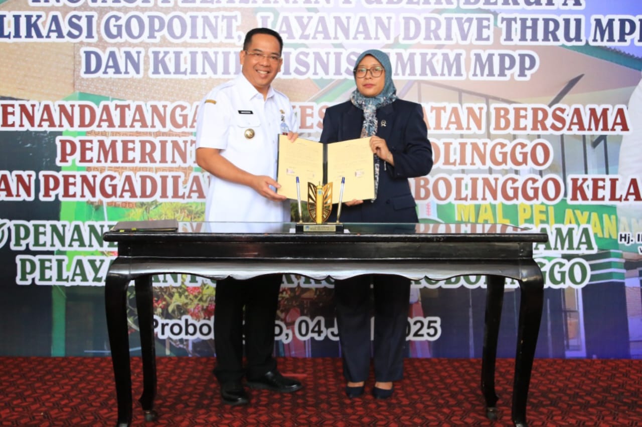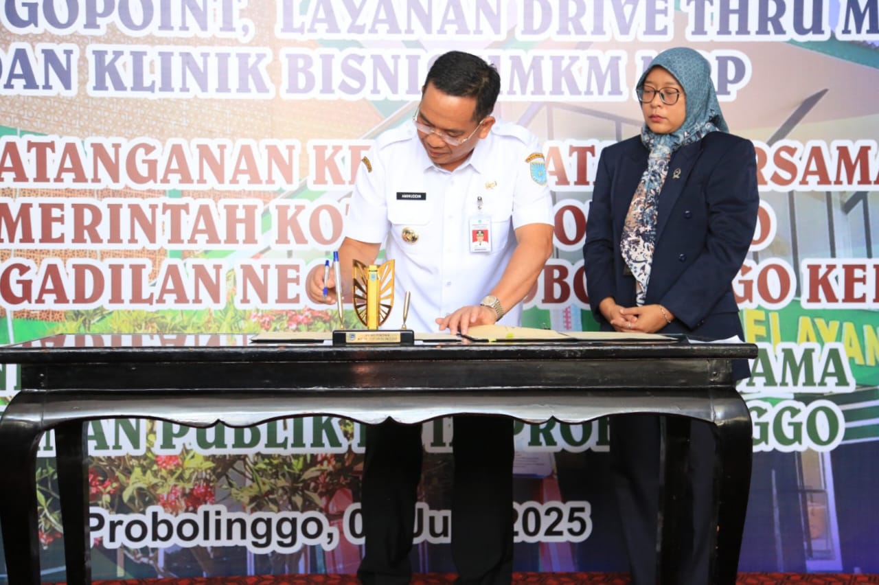 MAYANGAN – Setelah melaunching GO POINT (Probolinggo Potential Opportunity and Investment), di kesempatan ini, juga dilaksanakan penandatanganan kerja sama dengan Pengadilan Negeri Probolinggo berupa layanan integrasi, Rabu (4/6). Penandatanganan dilaksanakan Ketua Pengadilan Negeri Mellina Nawang Wulan dan Wali Kota Probolinggo dr Aminudin. Ia pun mengungkapkan rasa terima kasih atas komitmen Pengadilan Negeri melengkap pelayanan-pelayanan di MPP yang notabene bisa dimanfaatkan untuk seluruh instansi.