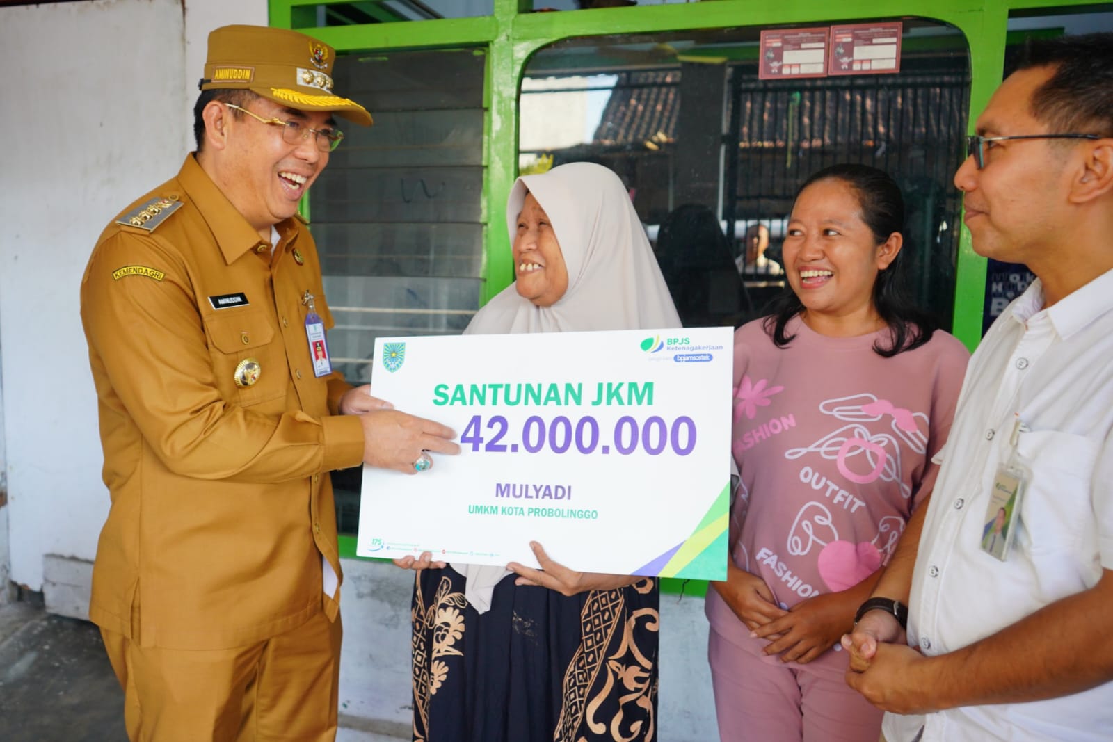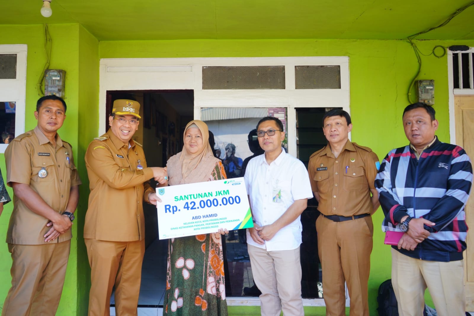 PROBOLINGGO - Pemerintah Kota Probolinggo bersama Badan Penyelenggara Jaminan Sosial (BPJS Ketenagakerjaan) menyerahkan santunan jaminan kematian (JKM) kepada para ahli waris peserta aktif BPJS dari kalangan nelayan, petani dan pelaku UMKM. Santuan tersebut diserahkan secara langsung oleh Wali Kota Probolinggo dr. Aminuddin di delapan lokasi berbeda, Selasa (22/7).