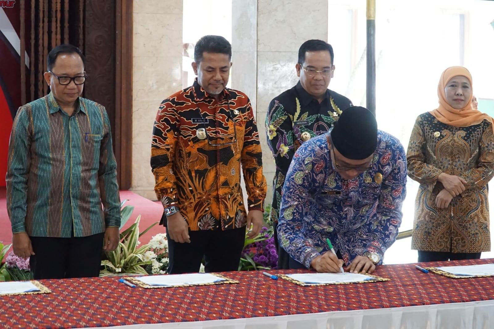 MALANG - Wali Kota Probolinggo dr. Aminuddin bersama Kepala Daerah se-Jatim Tandatangani Komitmen Bersama Akselerasi dan Keberlanjutan Manajemen Talenta. Acara ini dirangkai dalam rapat koordinasi (Rakor) evaluasi CASN dan manajemen talenta di Pendapa Agung, Kabupaten Malang, Kamis (24/7).