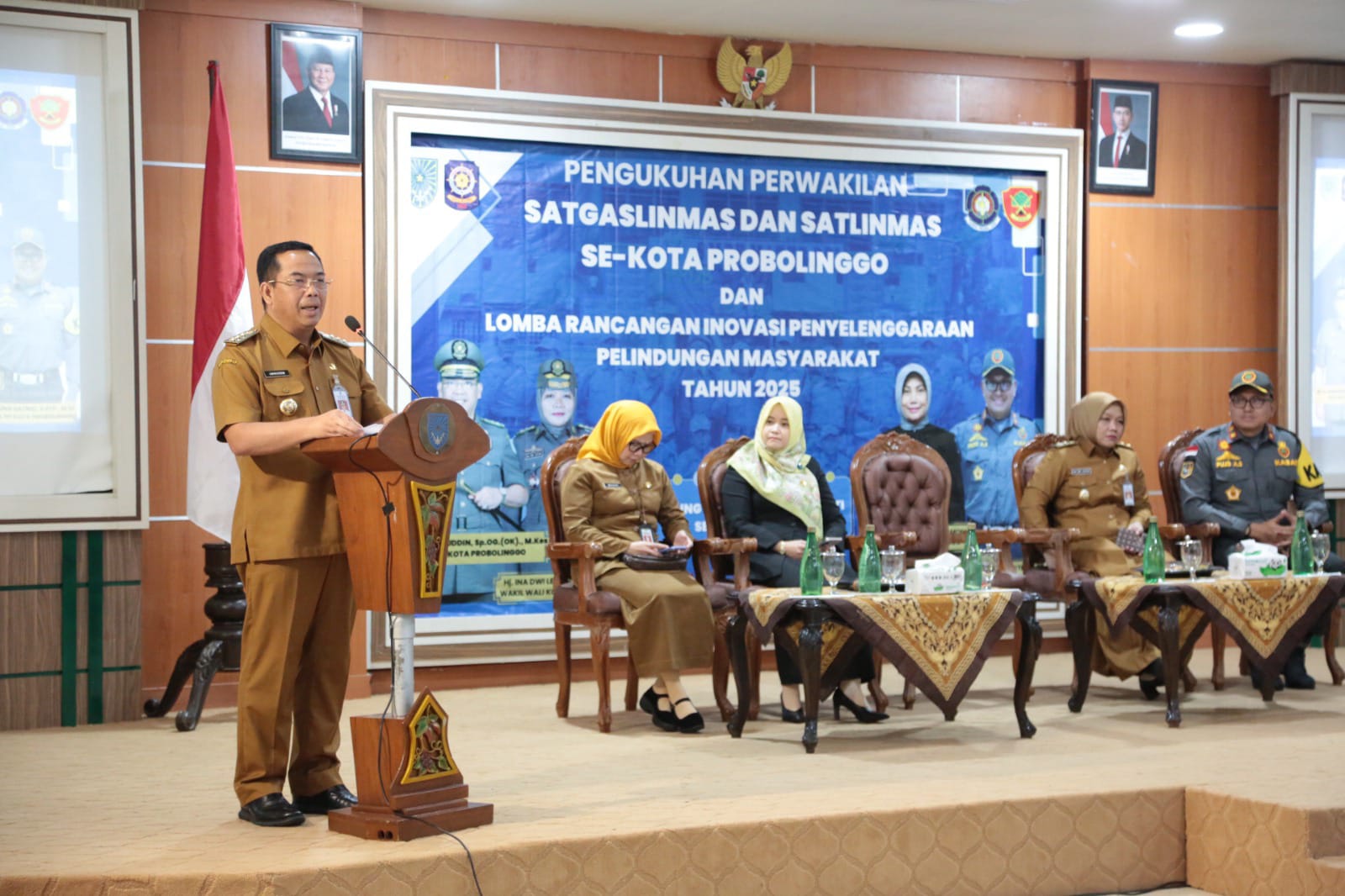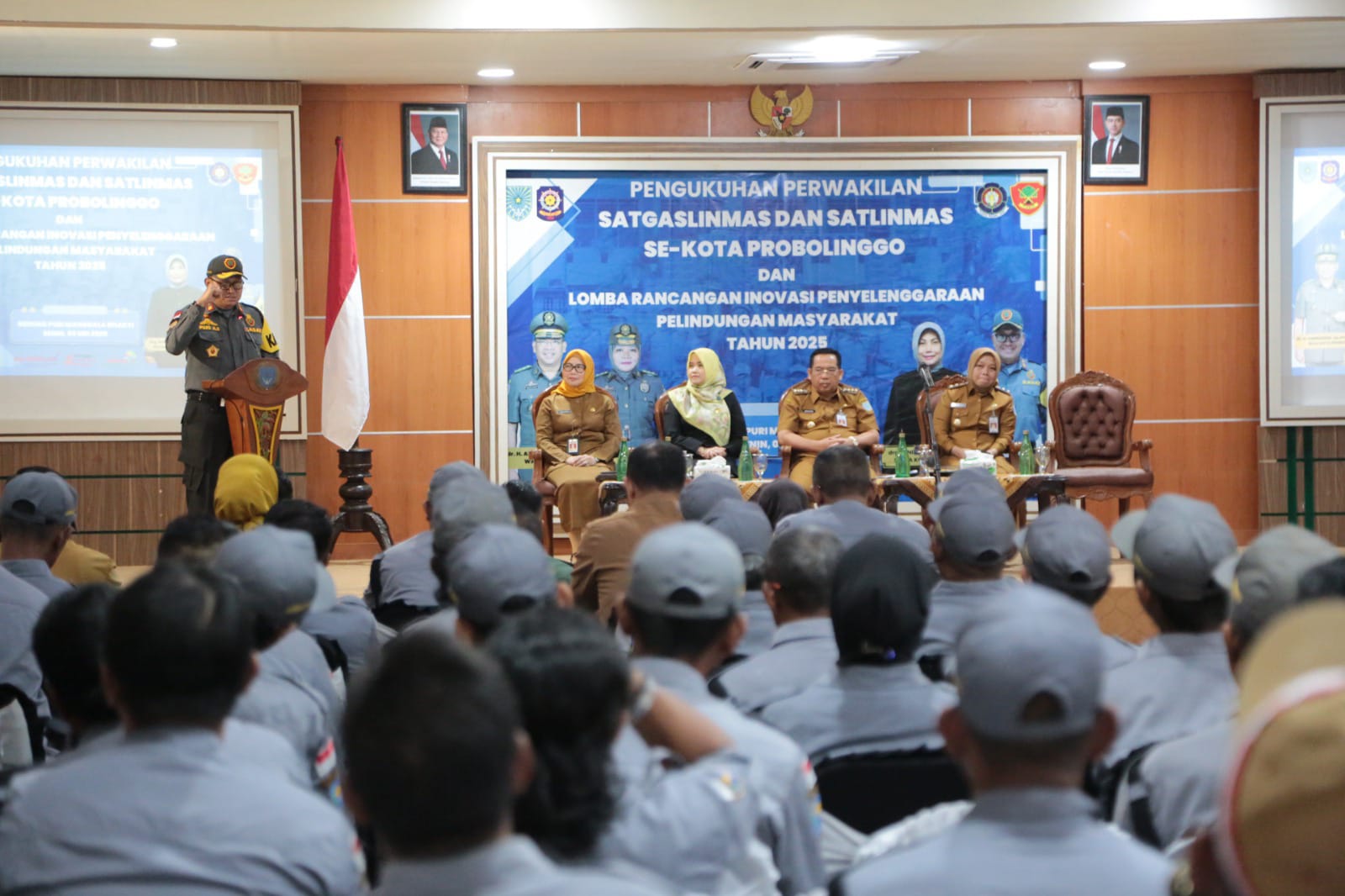 Kanigaran - Pemerintah Kota Probolinggo melalui Satuan Polisi Pamong Praja (Satpol PP) resmi mengukuhkan Satuan Tugas Perlindungan Masyarakat (Satgas Linmas) dan Satuan Perlindungan Masyarakat (Satlinmas) se-Kota Probolinggo. Pengukuhan yang berlangsung di Puri Manggala Bhakti, Kantor Wali Kota Probolinggo pada Senin (05/05) pagi, dikukuhkan secara langsung oleh Wali Kota Probolinggo dr. Aminuddin. Acara tersebut juga dirangkai dengan Lomba Rancangan Inovasi Penyelenggaraan Perlindungan Masyarakat.