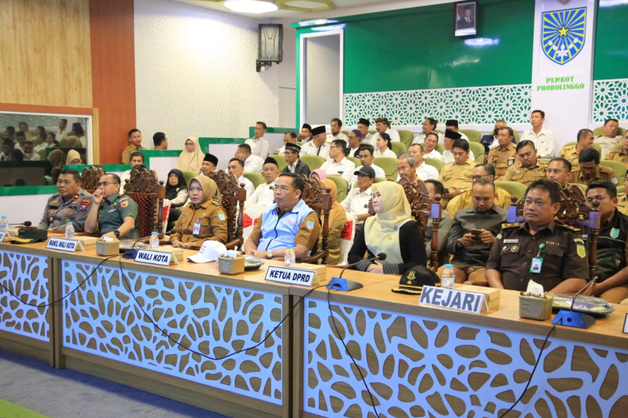 KANIGARAN - Wali Kota Probolinggo, dr. Aminuddin, mengikuti acara peluncuran Kelembagaan Koperasi Merah Putih secara virtual yang seremoninya dihadiri langsung oleh Presiden Republik Indonesia Prabowo Subianto, Senin (21/7). Peluncuran secara nasional ini berlangsung di Koperasi Desa Merah Putih Bentangan, Klaten, Jawa Tengah dan diikuti serentak oleh sejumlah kepala daerah di seluruh Indonesia.