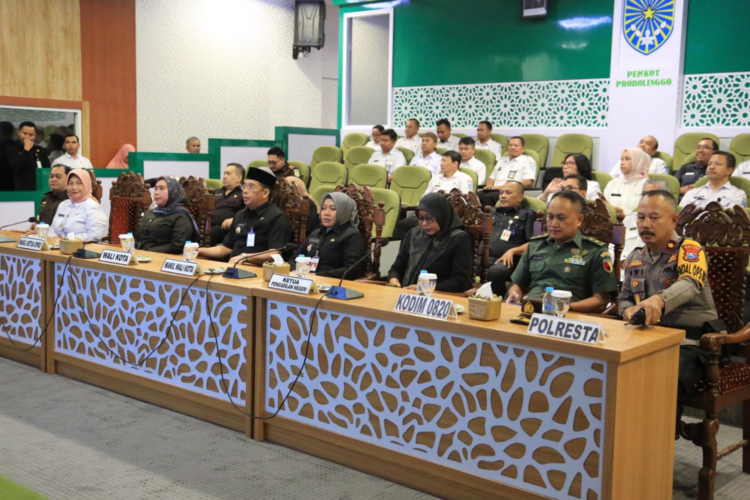 KANIGARAN – Wali Kota Probolinggo dr. Aminuddin, mengikuti peluncuran logo dan tema Hari Ulang Tahun (HUT) ke-80 Kemerdekaan Republik Indonesia tahun 2025 yang diselenggarakan secara nasional melalui zoom meeting, di Command Center Kantor Wali Kota, Rabu (23/7). Kegiatan ini juga diikuti Wakil Wali Kota Ina Dwi Lestari, Sekretaris Daerah drg. Ninik Ira Wibawati, jajaran Forkopimda, dan kepala perangkat daerah.