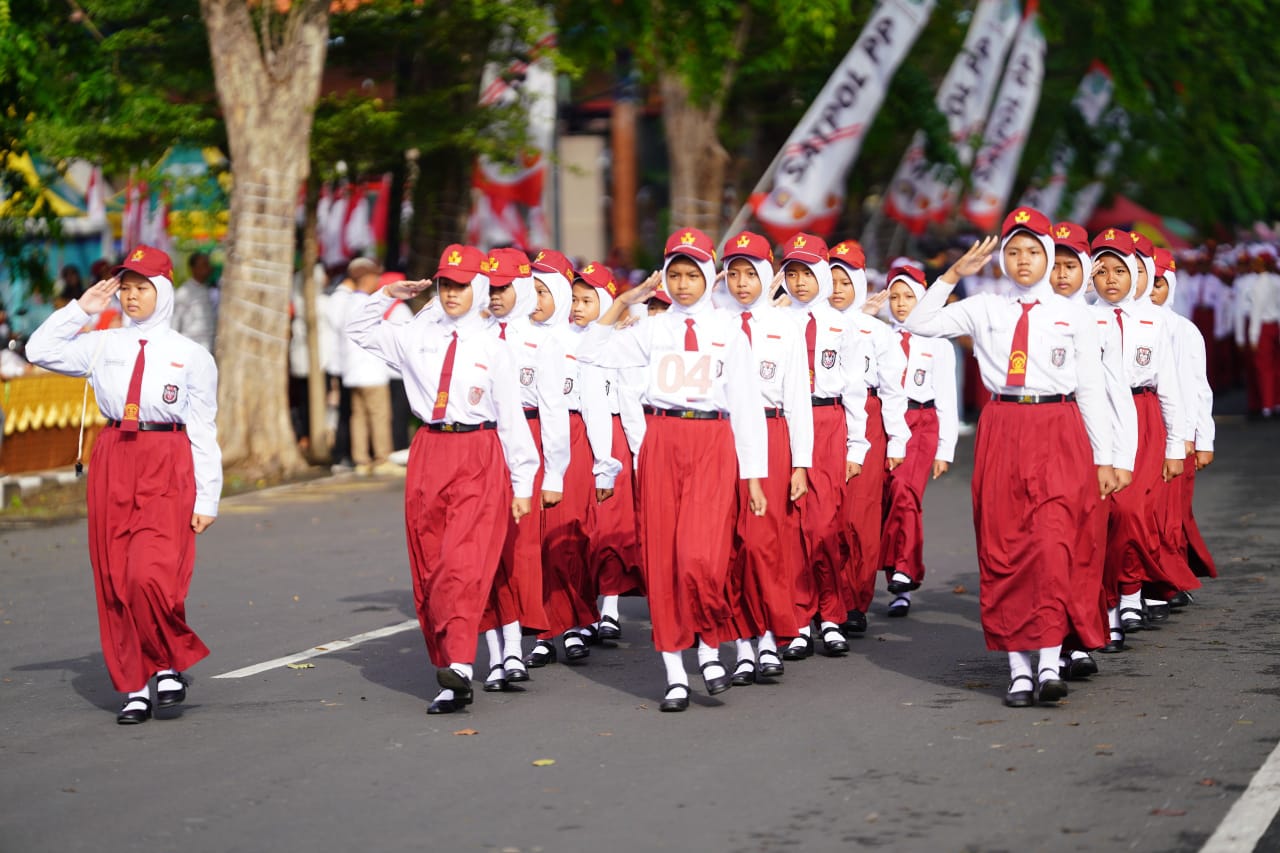 Peserta tampak berbaris rapi mengenakan seragam sekolah. Sepanjang rute, mereka meneriakkan yel-yel penuh semangat, sementara warga kota memberikan dukungan dengan sorakan dan tepuk tangan.