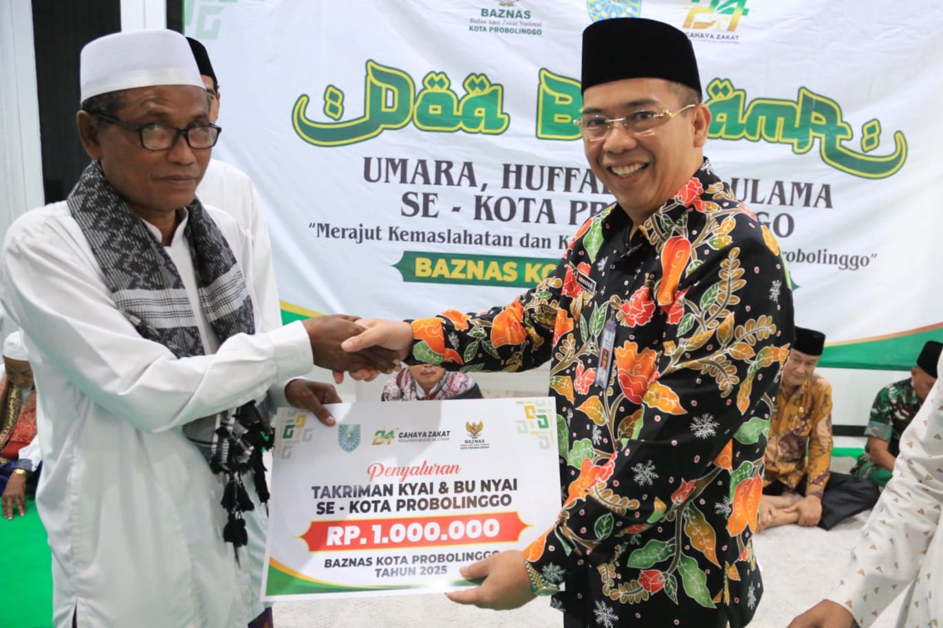 Kanigaran - Kamis, (27/3) siang menjadi momen penuh keberkahan di Rumah Dinas Wali Kota Probolinggo. Wali Kota secara langsung menyerahkan bantuan takriman kepada kiai, bu nyai, serta hufaz se-Kota Probolinggo. Masing-masing menerima bantuan sebesar Rp.1 juta sebagai bentuk apresiasi atas pengabdian mereka dalam mendidik umat dan menjaga keharmonisan masyarakat.