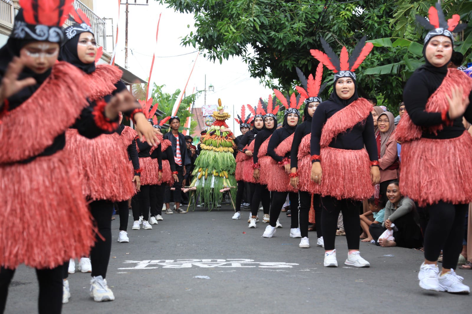 MAYANGAN - Panggung seni budaya di masing-masing kelurahan atau kecamatan tahun ini benar-benar hidup dan penuh warna, salah satunya di sepanjang Jalan Wijaya Kusuma, Kelurahan Sukabumi Mayangan. Belasan komunitas dari perwakilan masing-masing RT setempat mempersembahkan pertunjukan seni bertema Pawai Budaya Gunungan Hasil Bumi pada Minggu (6/7) siang.