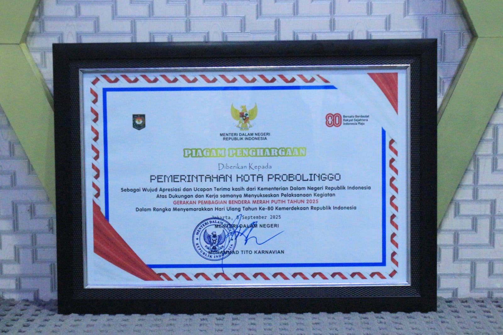 KANIGARAN - Pemerintah Kota Probolinggo menerima piagam penghargaan dari Kementerian Dalam Negeri (Kemendagri) sebagai bentuk apresiasi dan ucapan terima kasih atas dukungan serta kerja sama aktif dalam menyukseskan pelaksanaan Gerakan Pembagian Bendera Merah Putih Tahun 2025. Gerakan nasional tersebut digelar dalam rangka menyemarakkan peringatan HUT ke-80 Kemerdekaan Republik Indonesia.