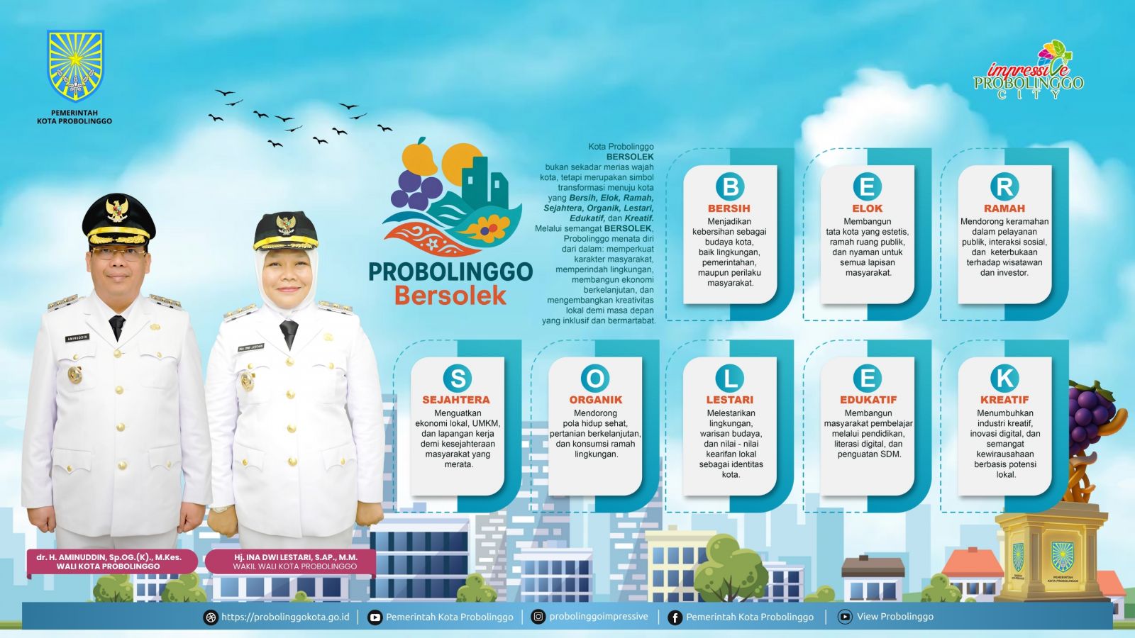 Kota Probolinggo BERSOLEK bukan sekadar merias wajah kota, tetapi merupakan simbol transformasi menuju kota yang Bersih, Elok, Ramah, Sejahtera, Organik, Lestari, Edukatif, dan Kreatif.