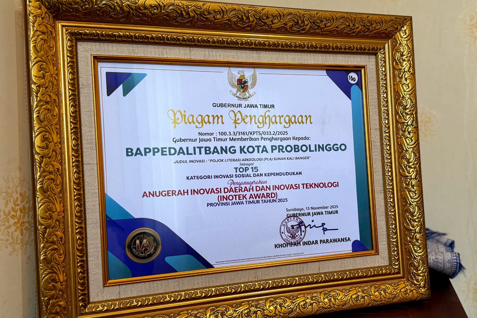 SURABAYA – Pemerintah Kota Probolinggo berhasil mengukir prestasi. Inovasi Pojok Literasi Arkeologi Sunan Kali Banger (Sinau Kang Tenanan, Kabudayan, Literasi Babad lan Paugeran) di Kelurahan Sukabumi – Kecamatan Mayangan, masuk dalam Top 15 Kategori Inovasi Sosial dan Kependudukan dalam Anugerah Inovasi Daerah dan Inovasi Teknologi (INOTEK) Award Provinsi Jawa Timur Tahun 2025.